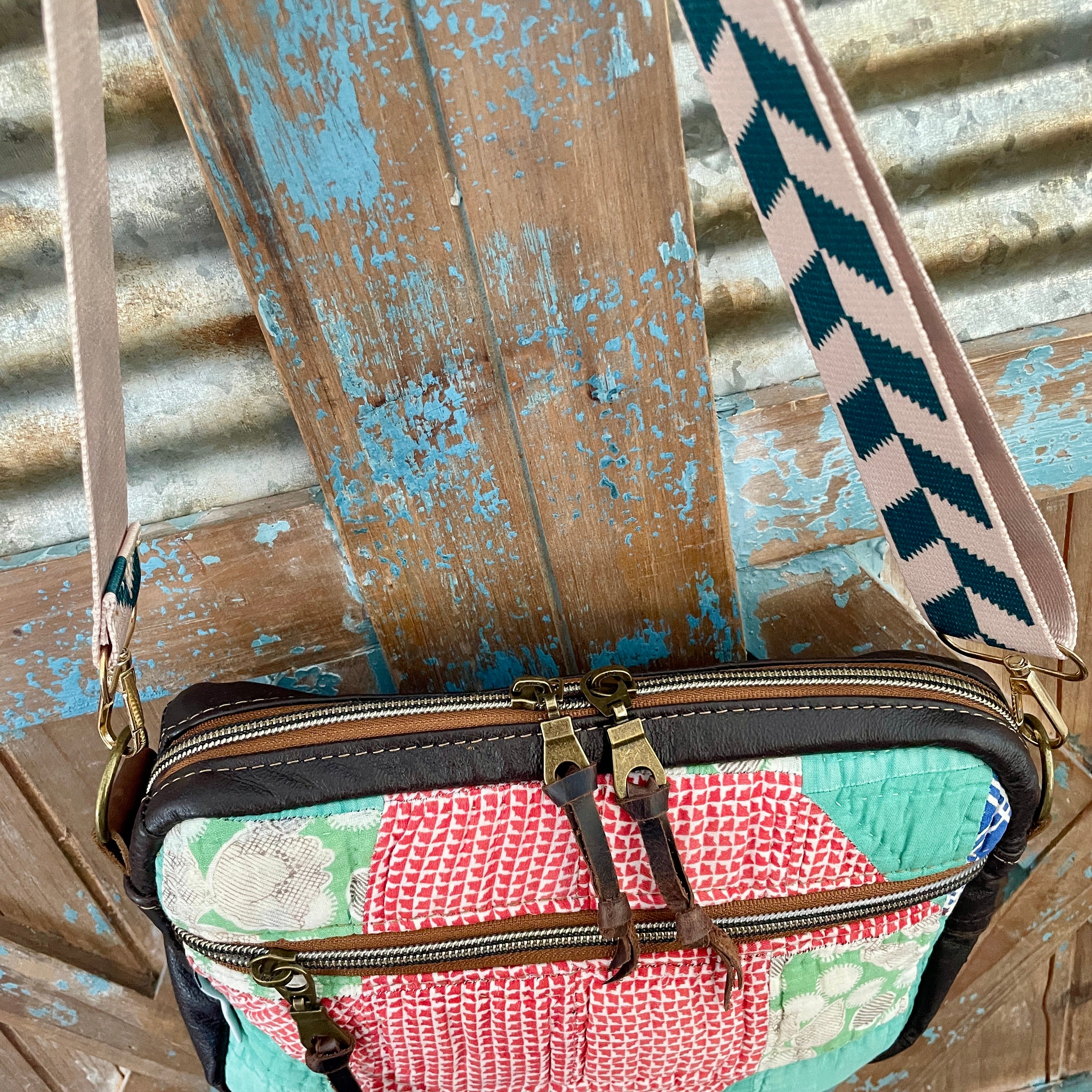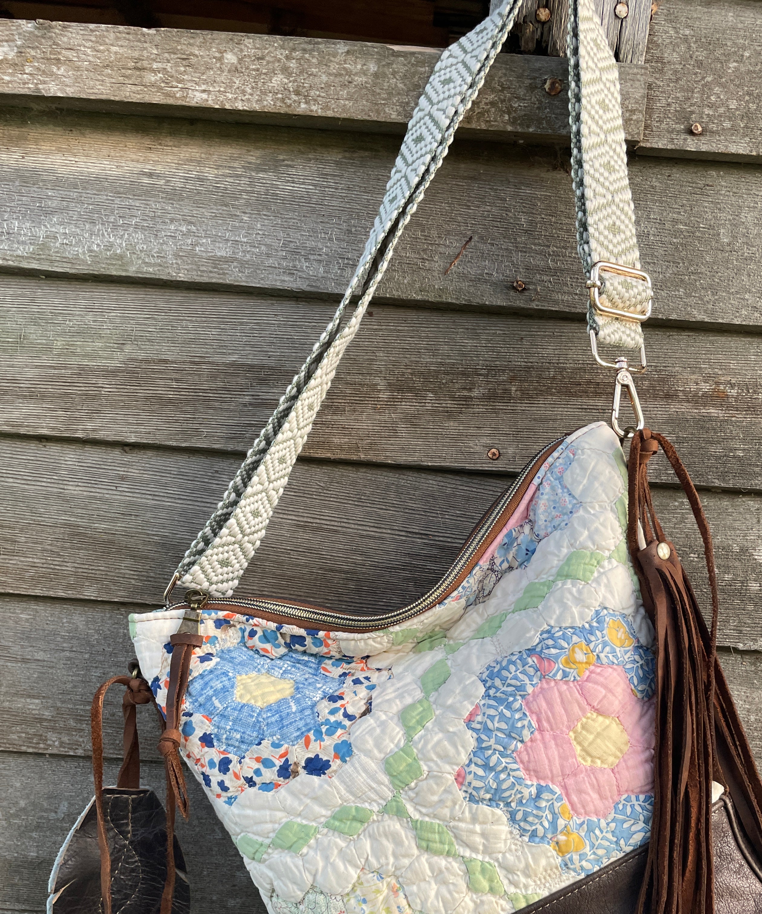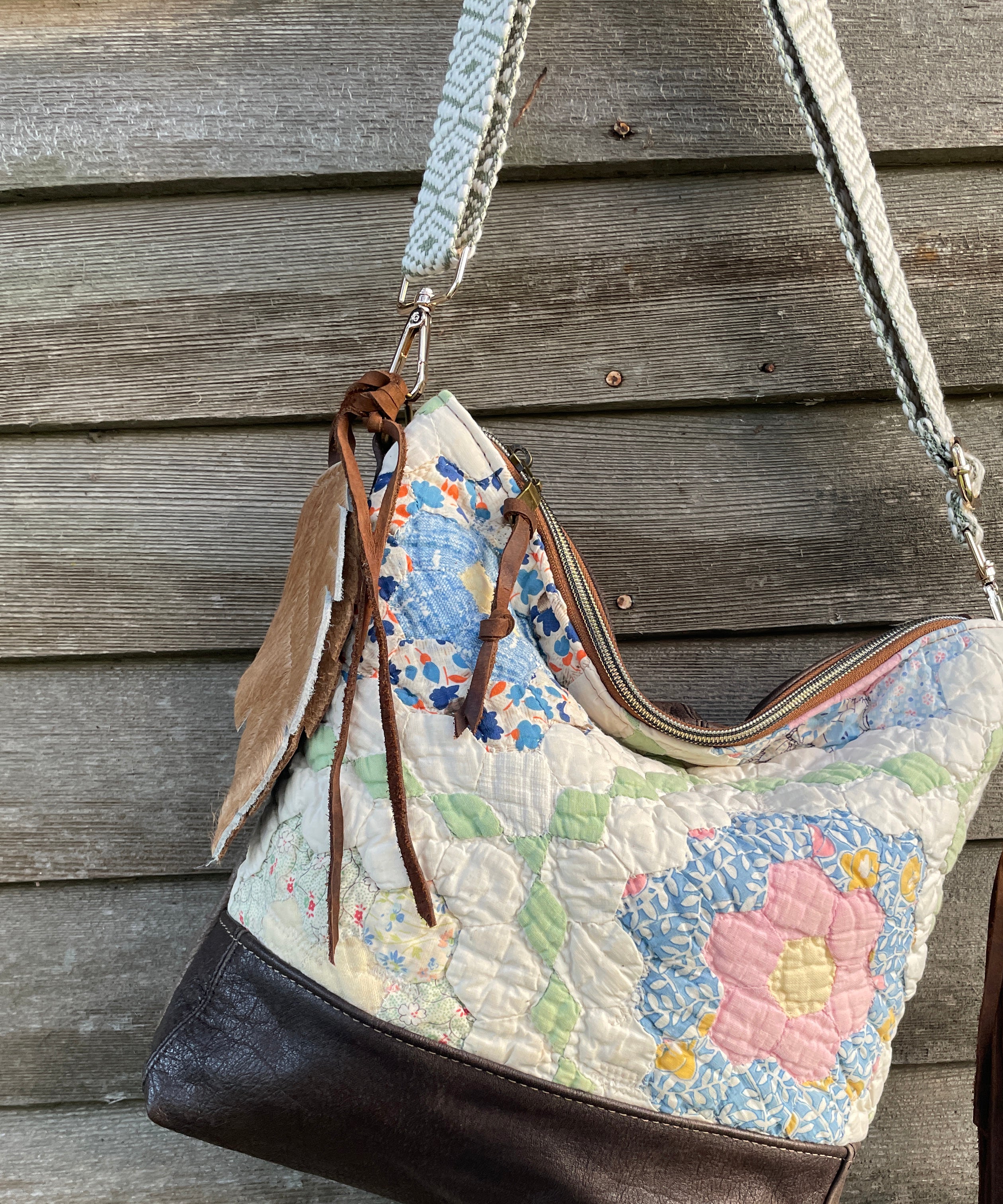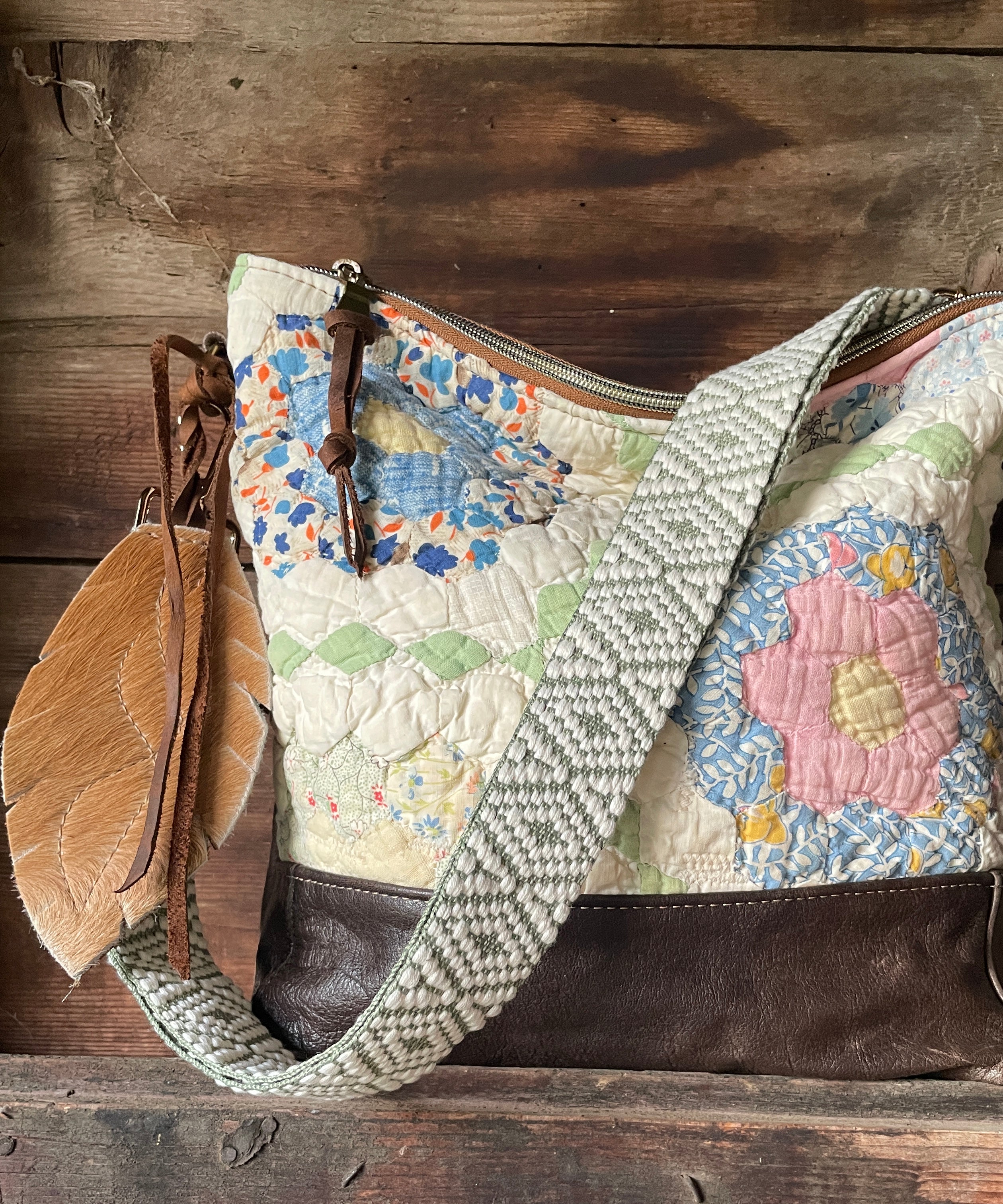 This bag!! Made with the prettiest antique quilt and genuine bomber jacket leather. The quilt was 100% hand stitched!