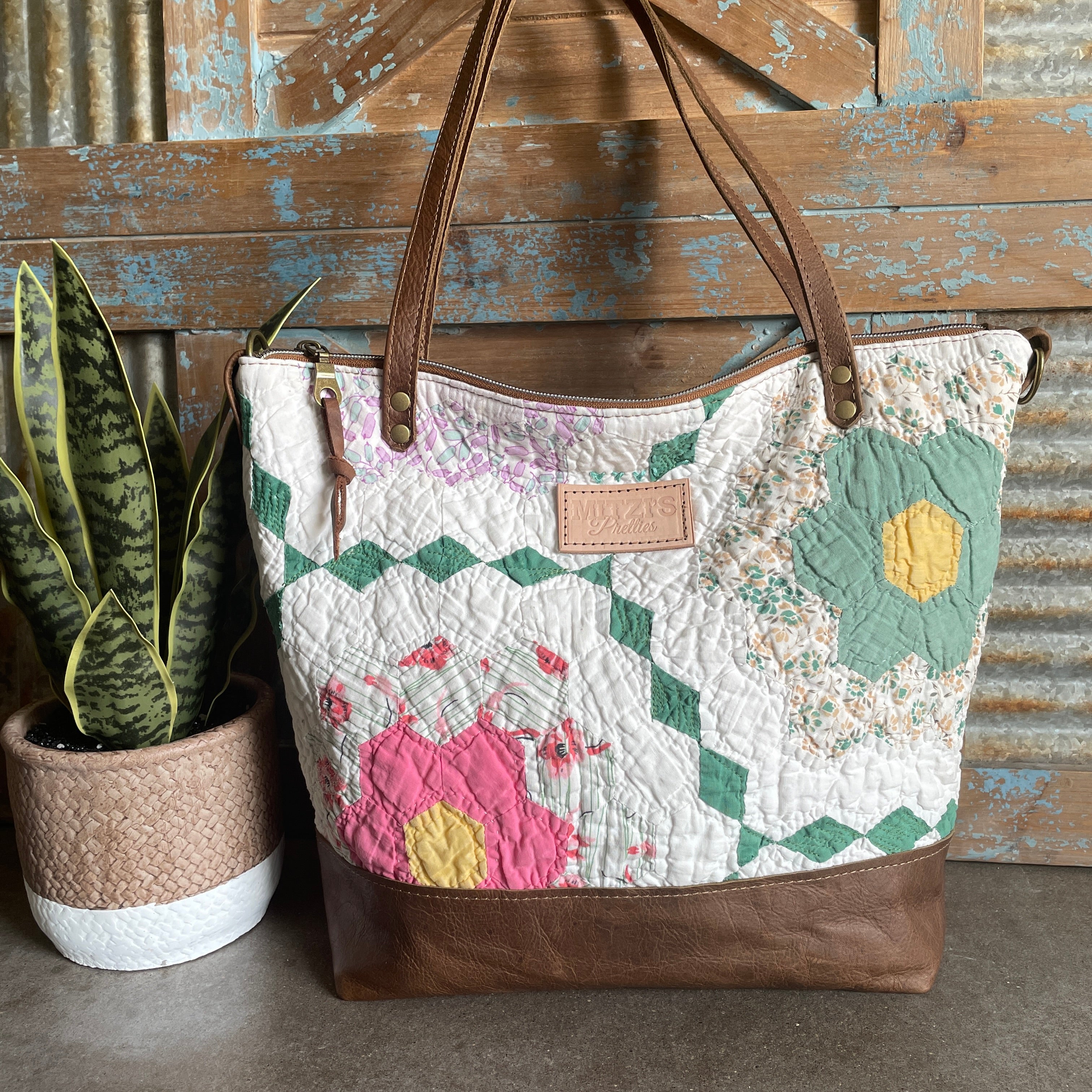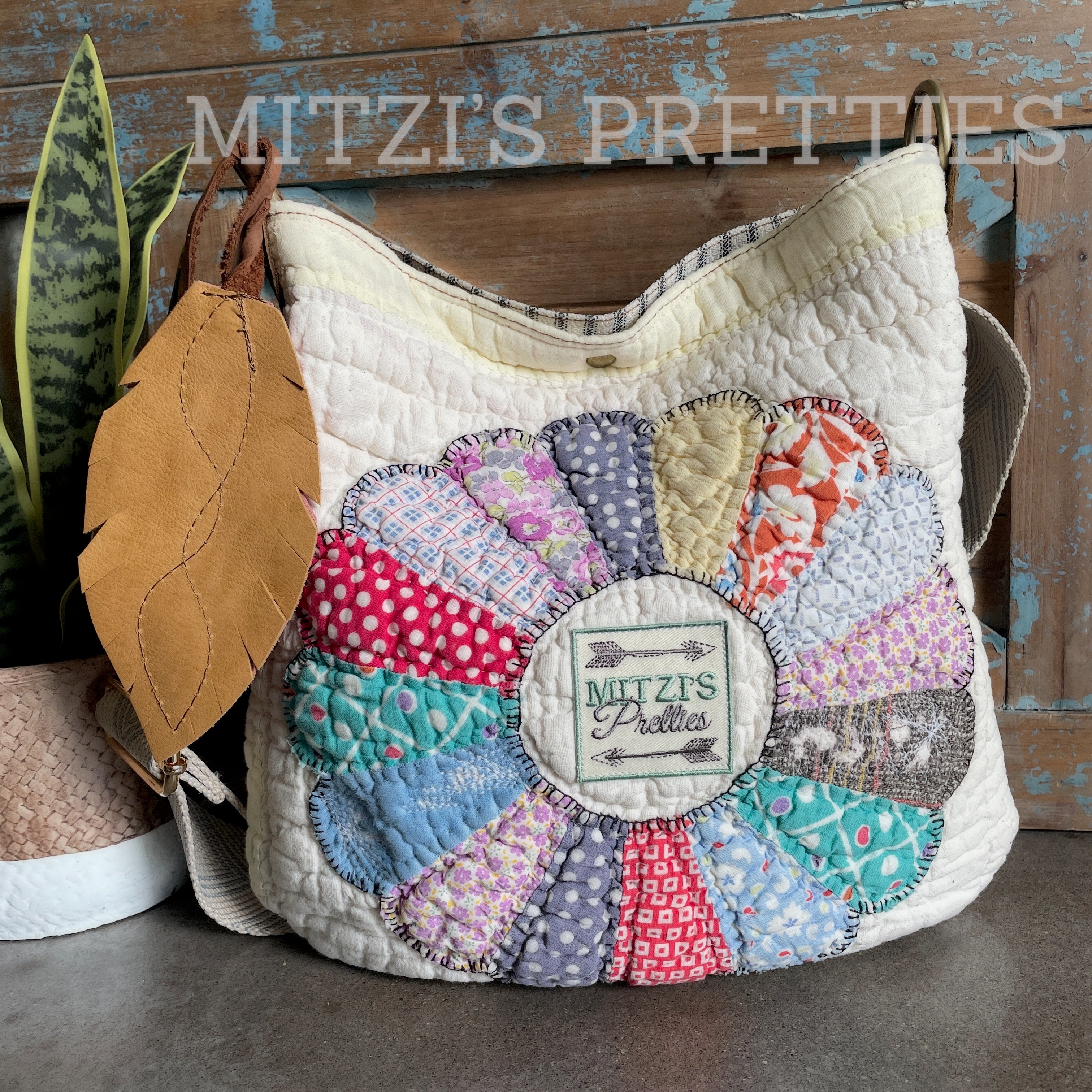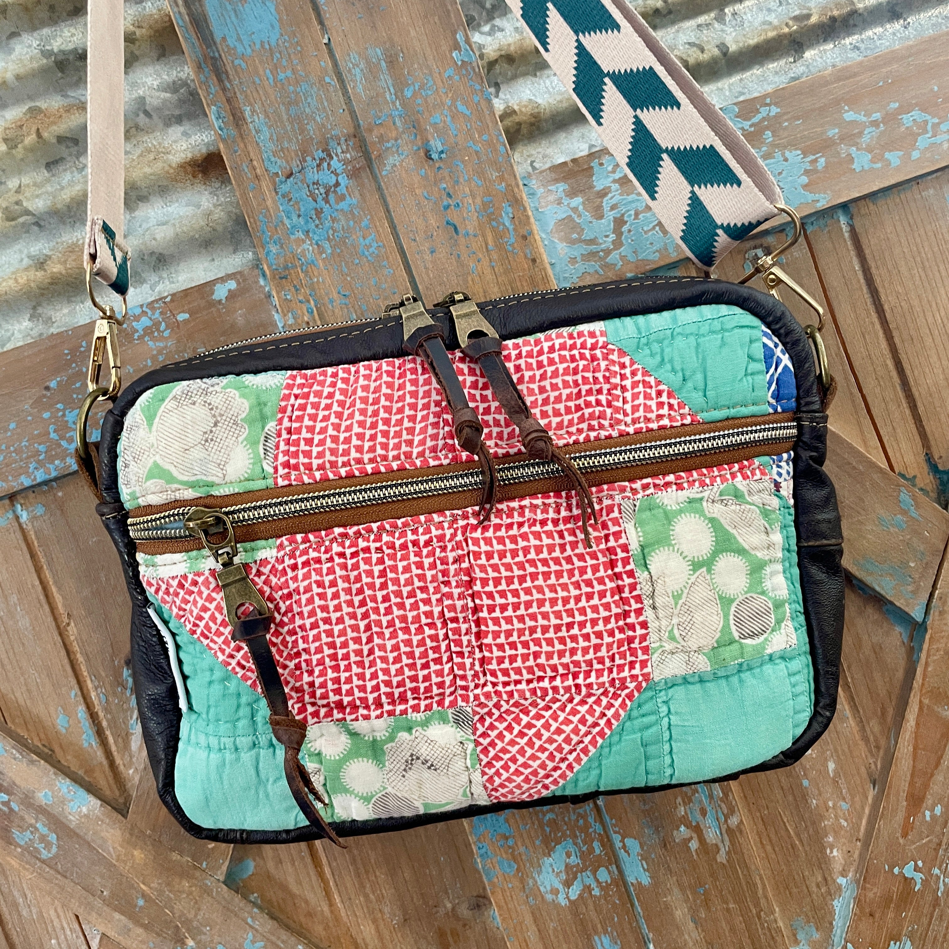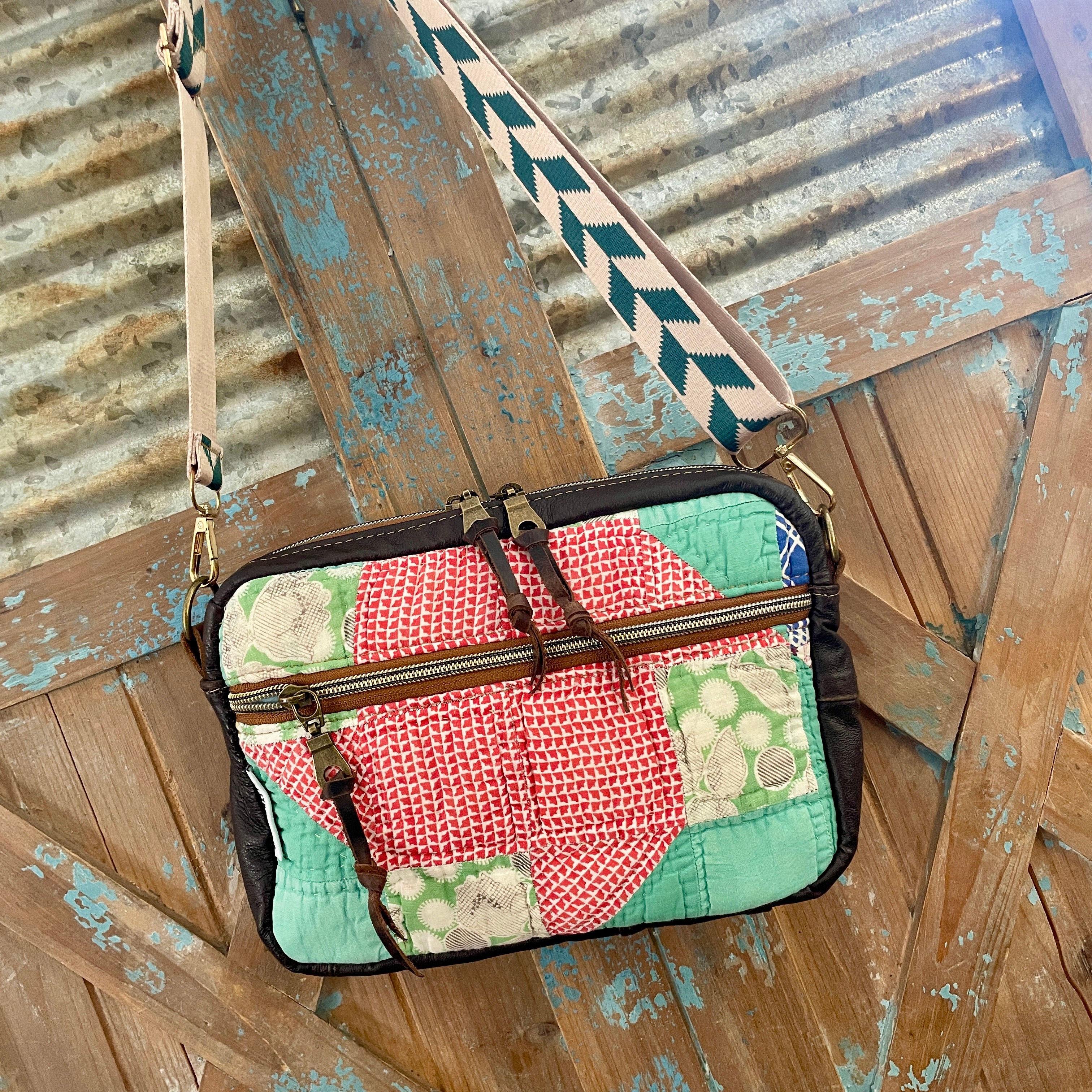 This bag!! Made with the prettiest antique quilt and genuine bomber jacket leather. The quilt was 100% hand stitched!