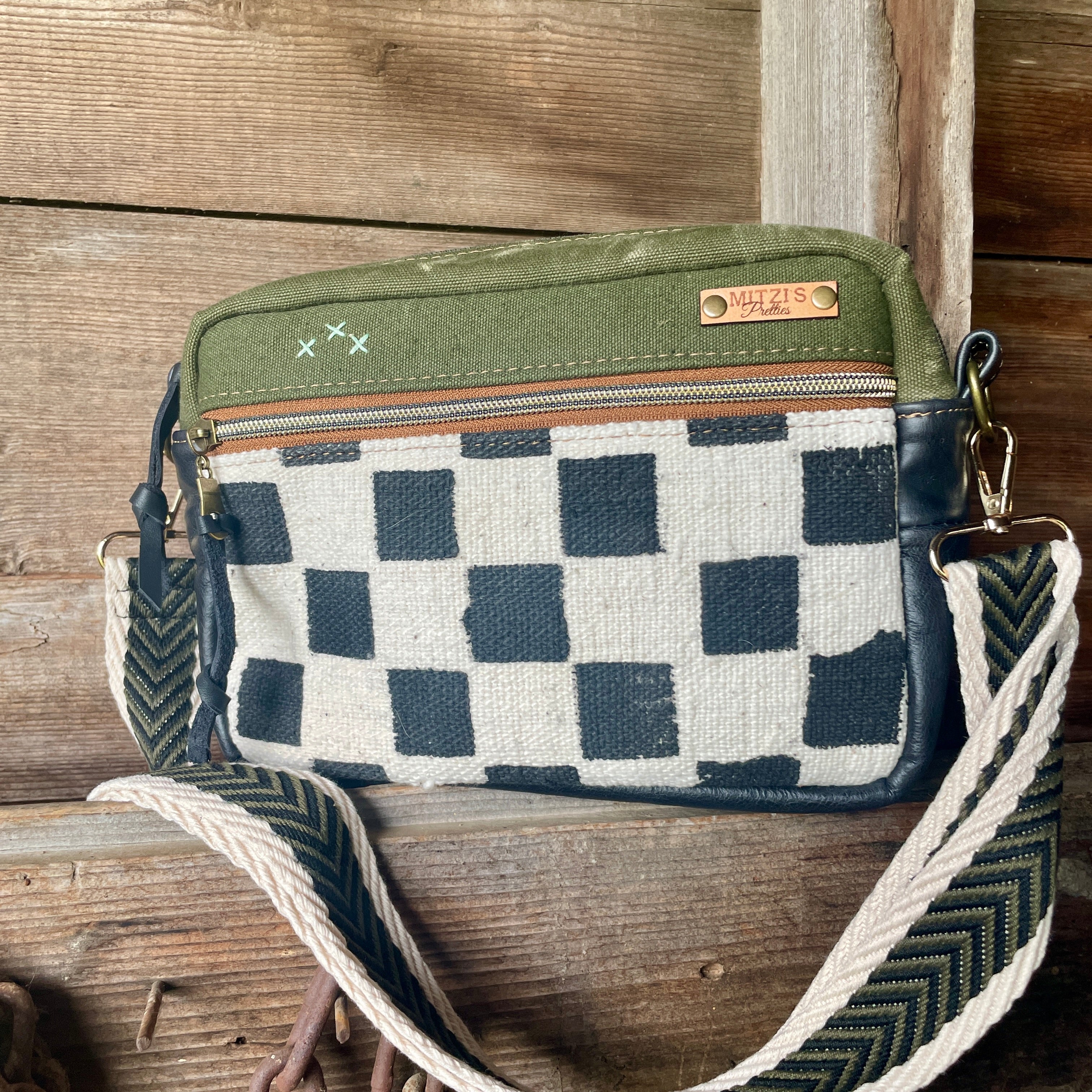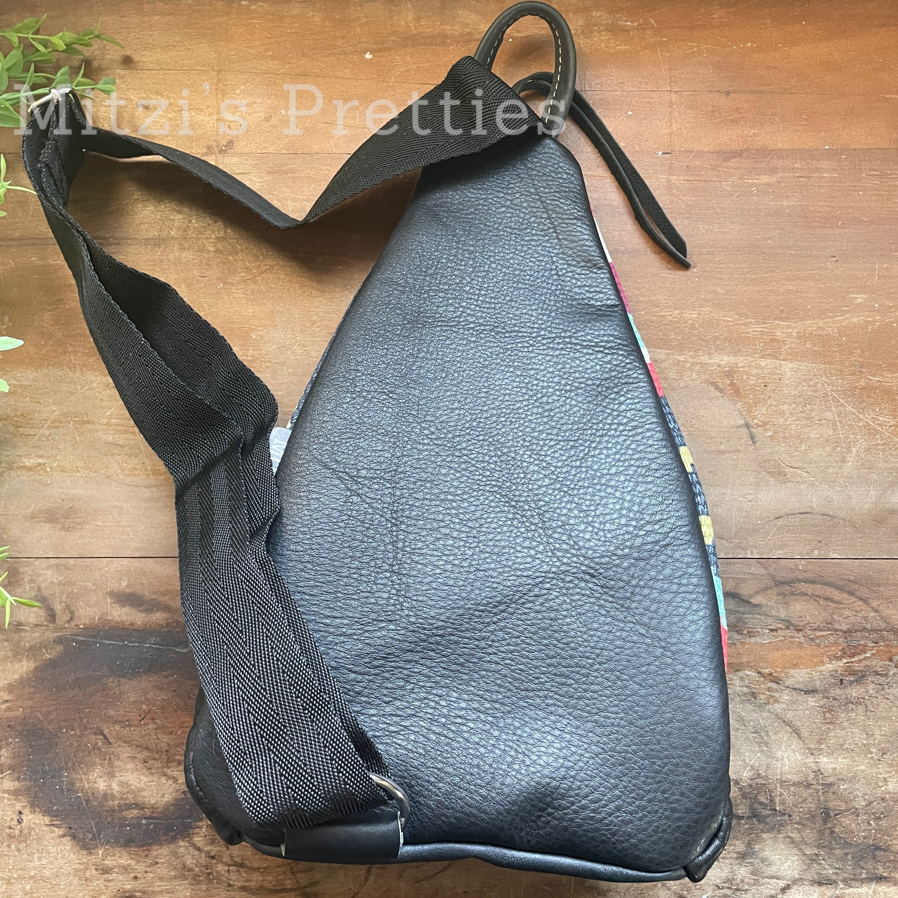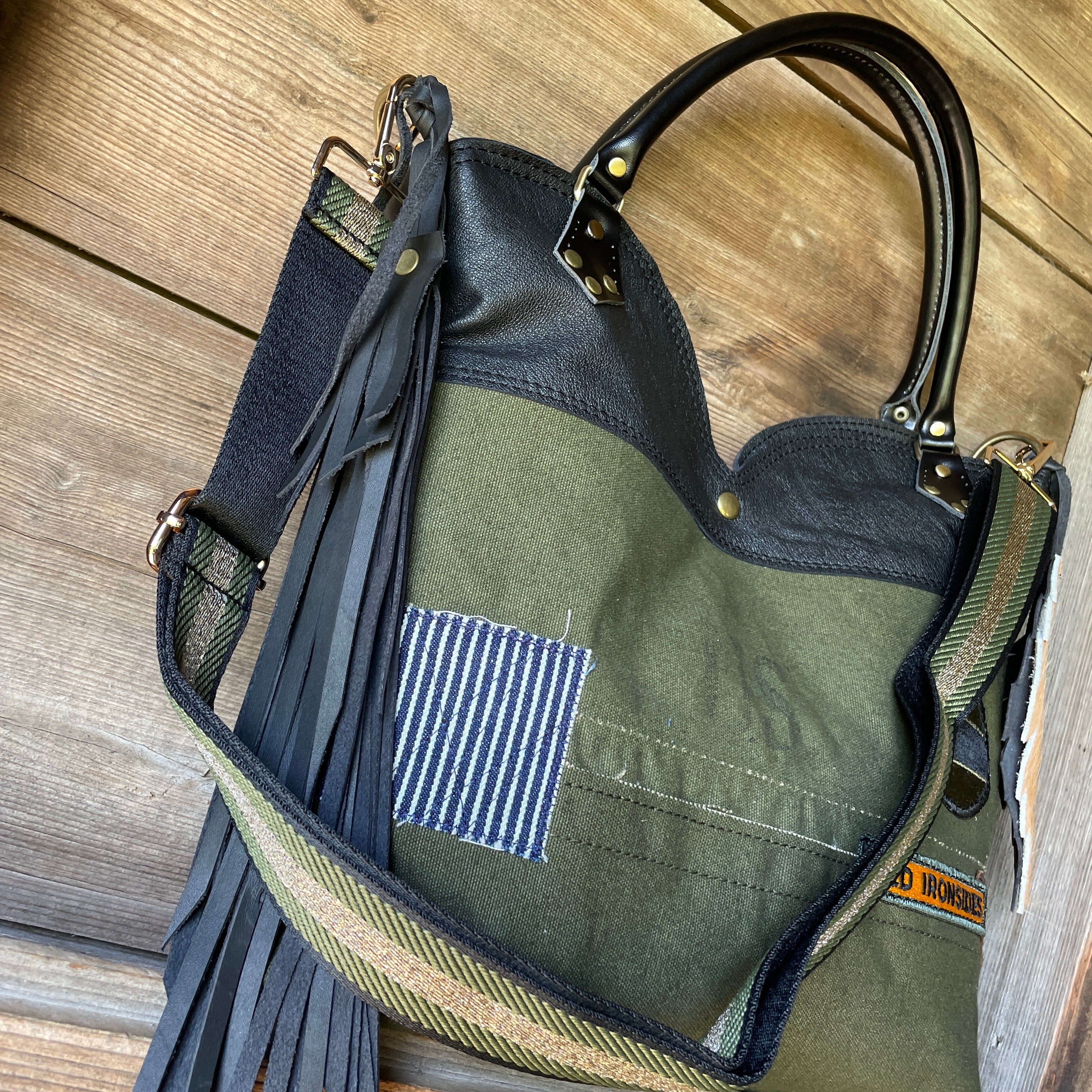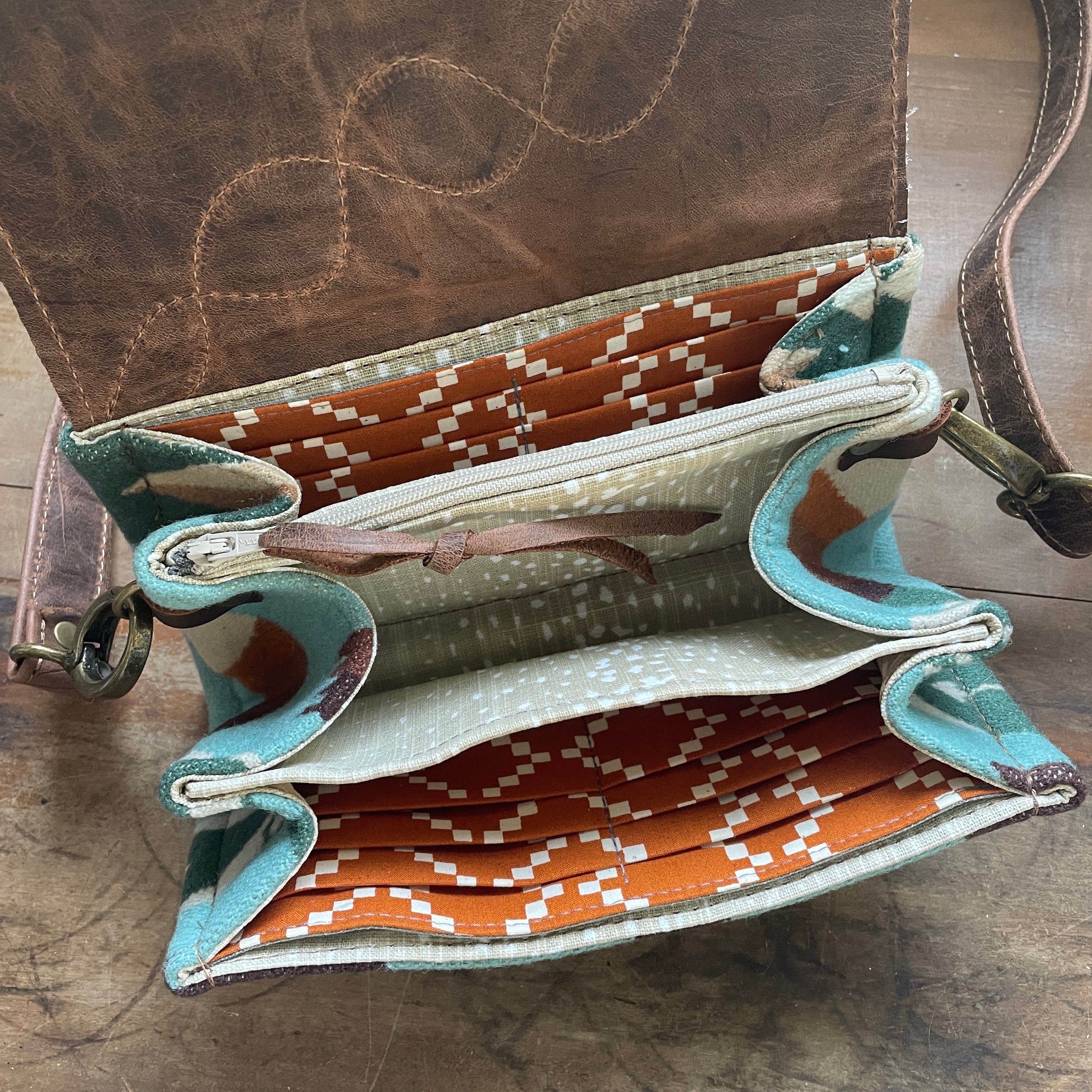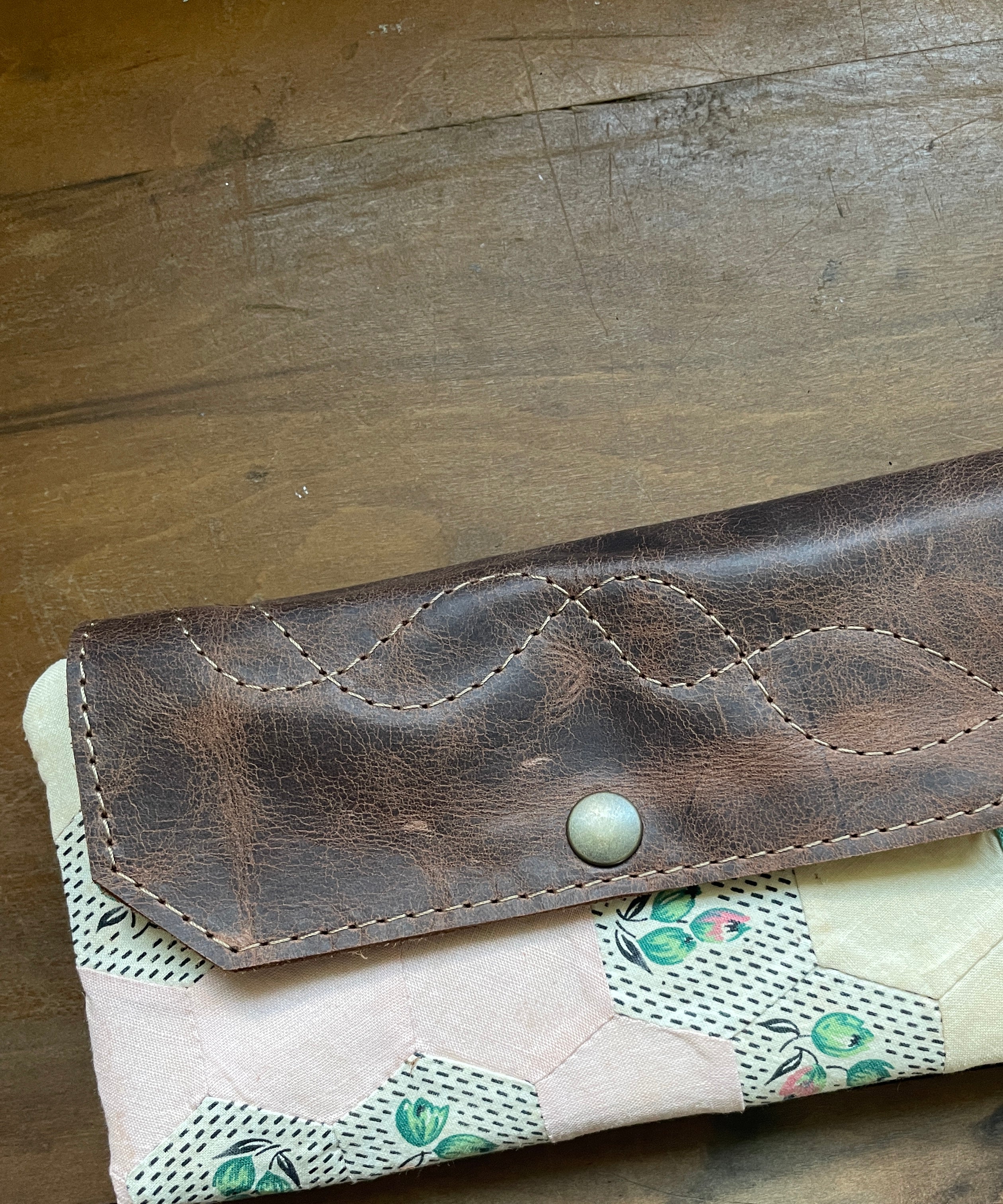This bag!! Made with the prettiest antique quilt and genuine bomber jacket leather. The quilt was 100% hand stitched!