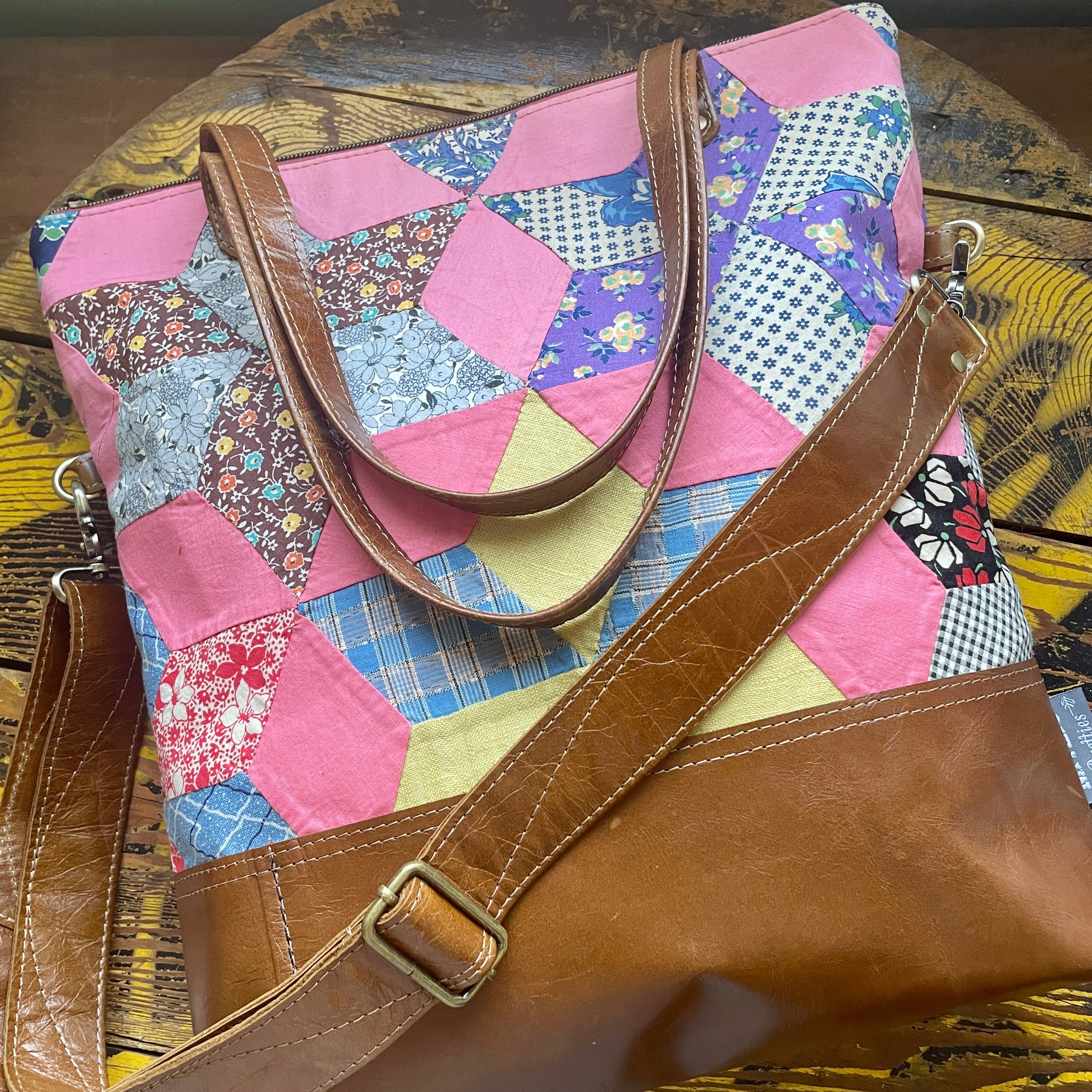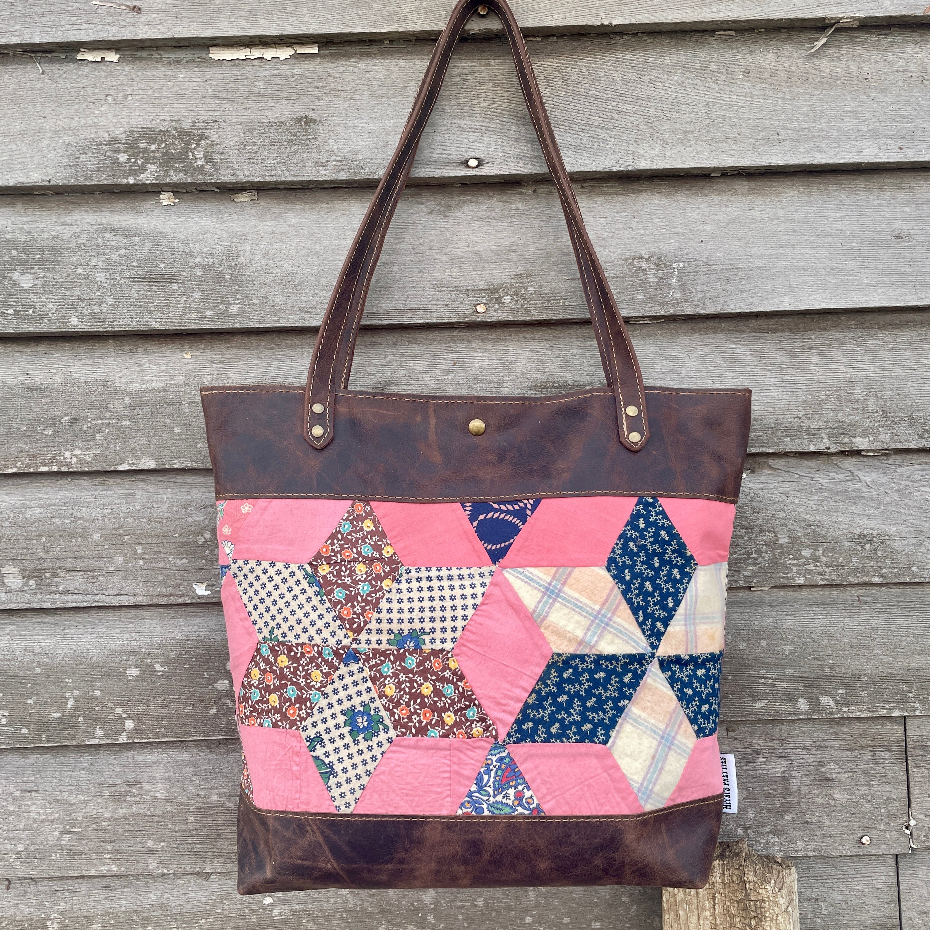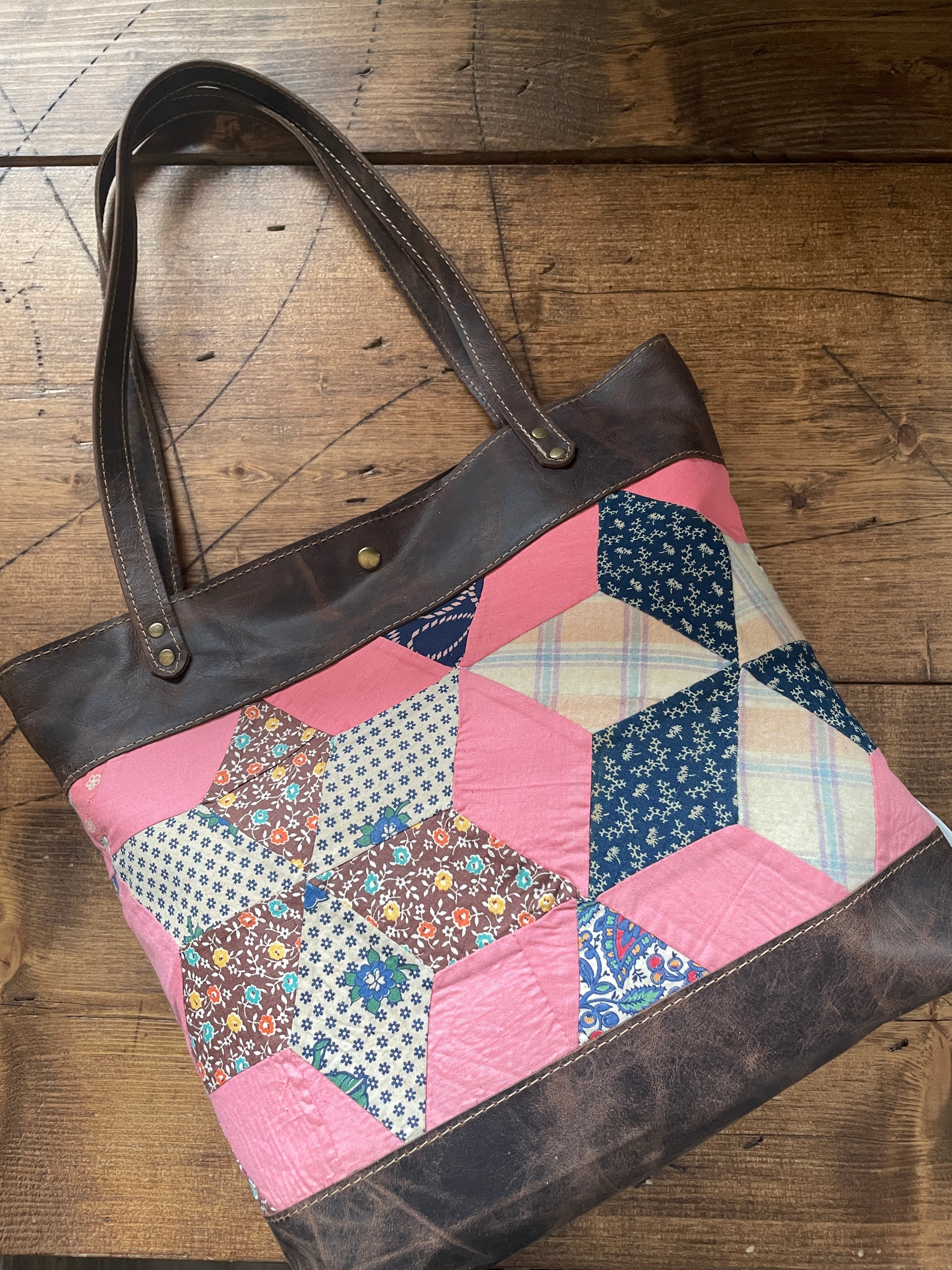 Made with vintage hand stitched quilt and leather. Super one of a kind bag!