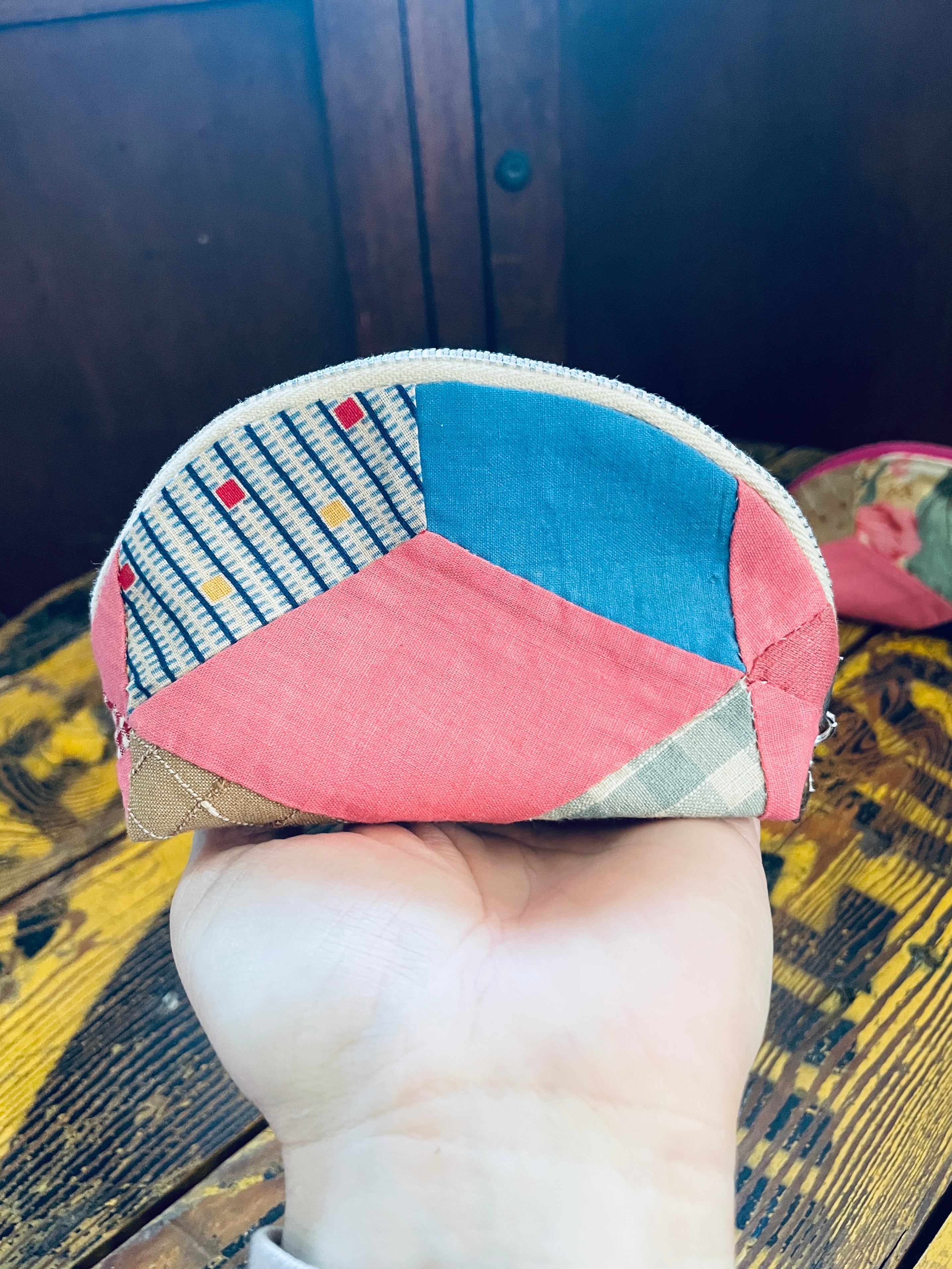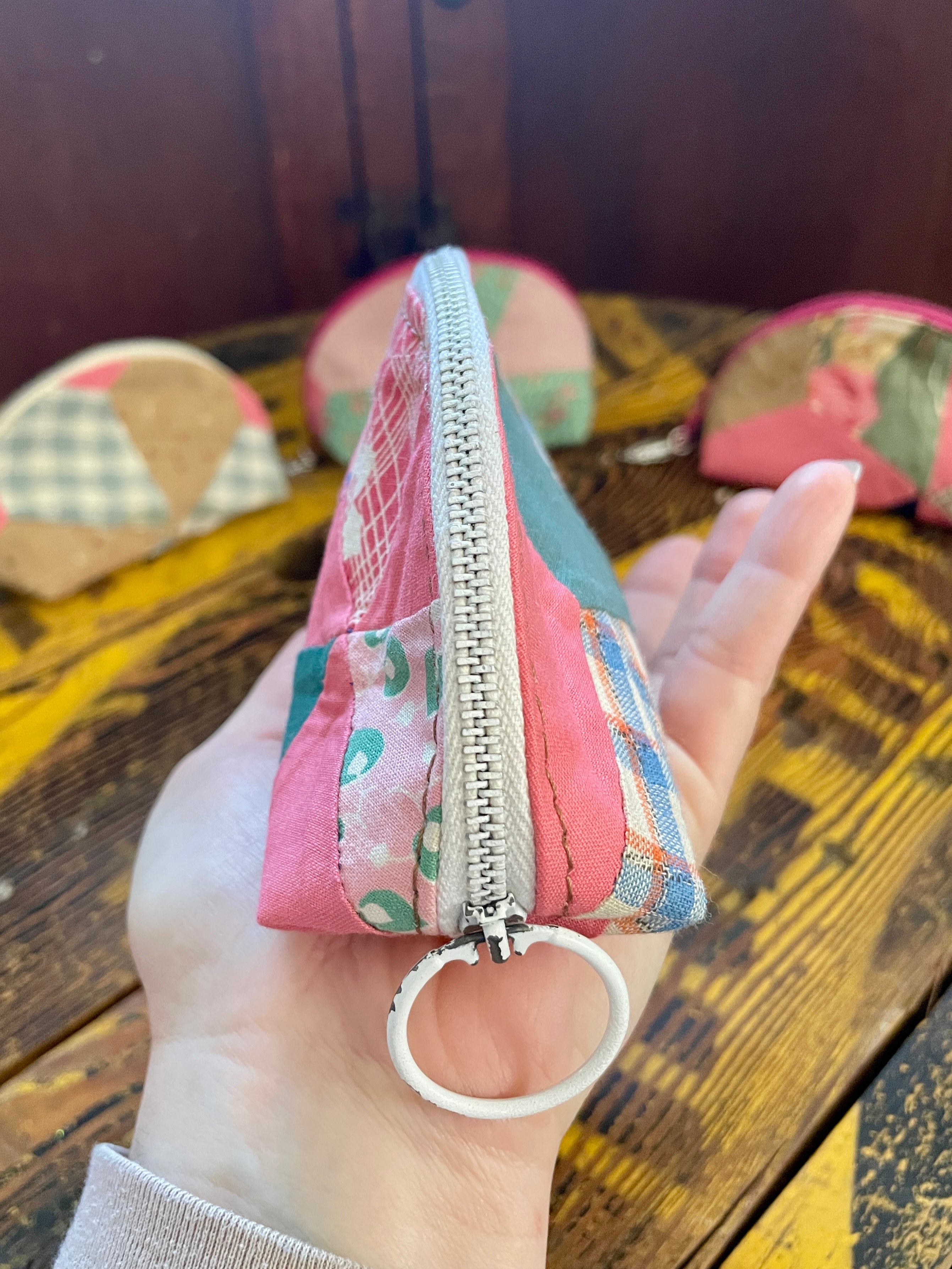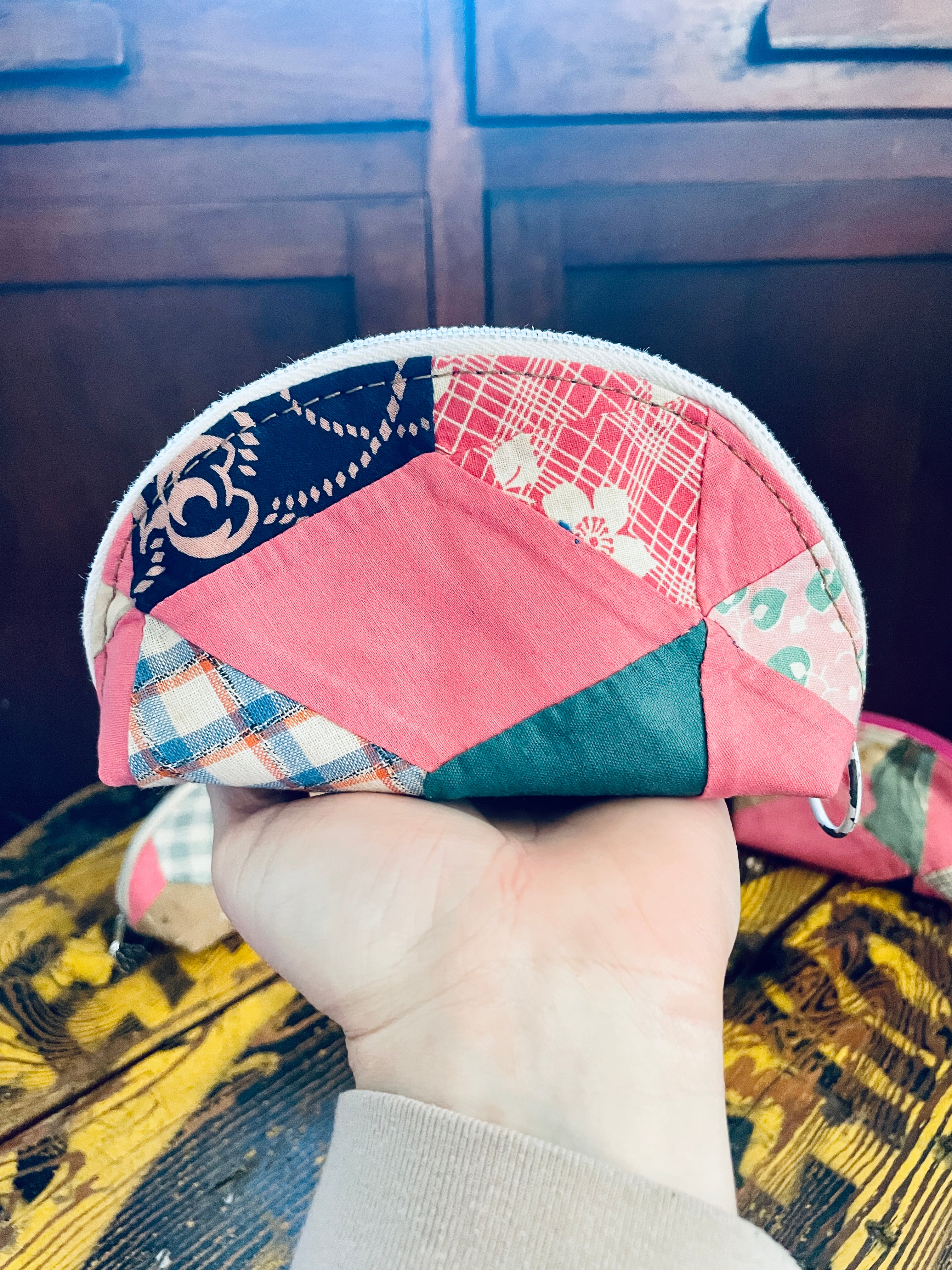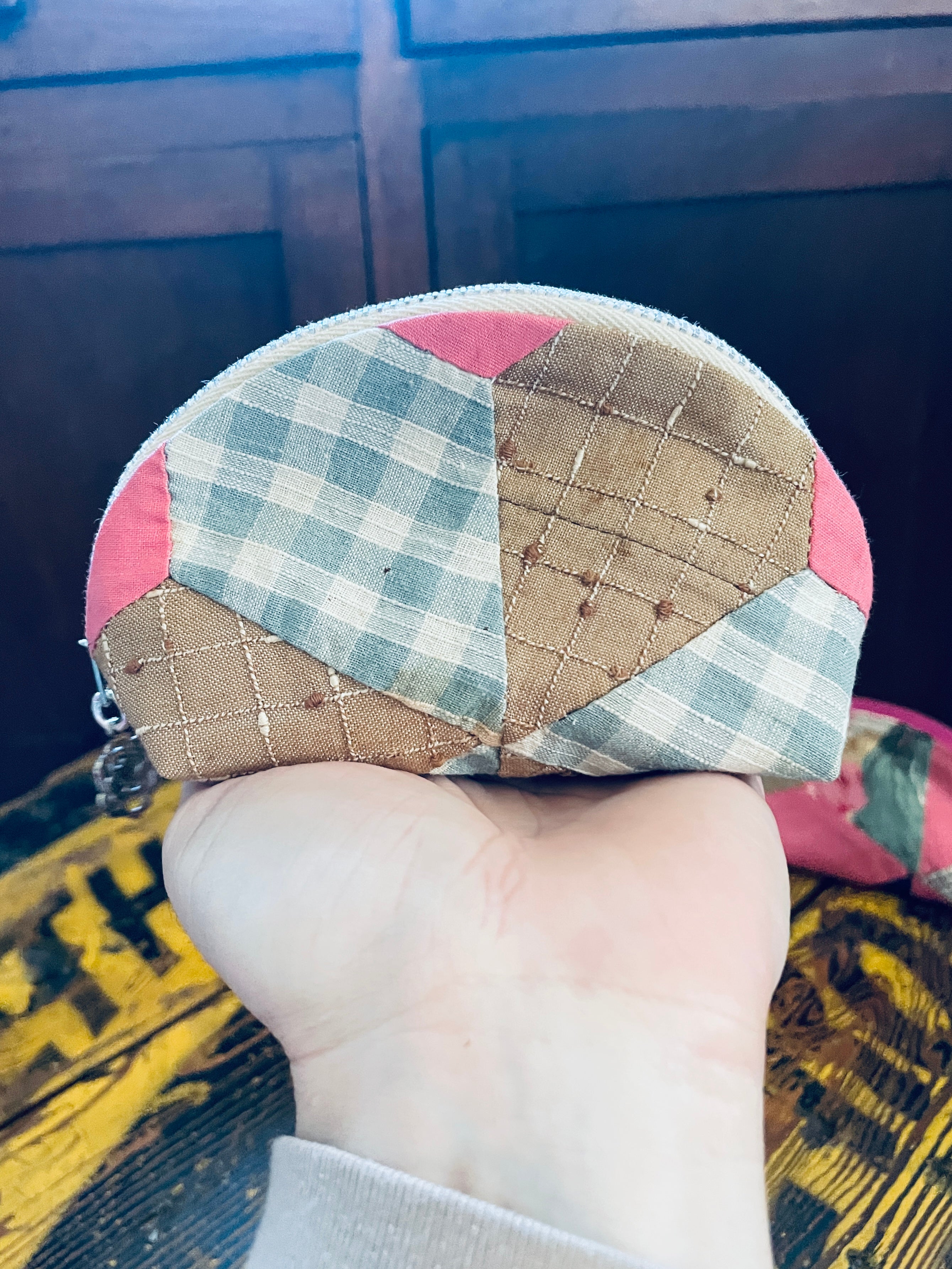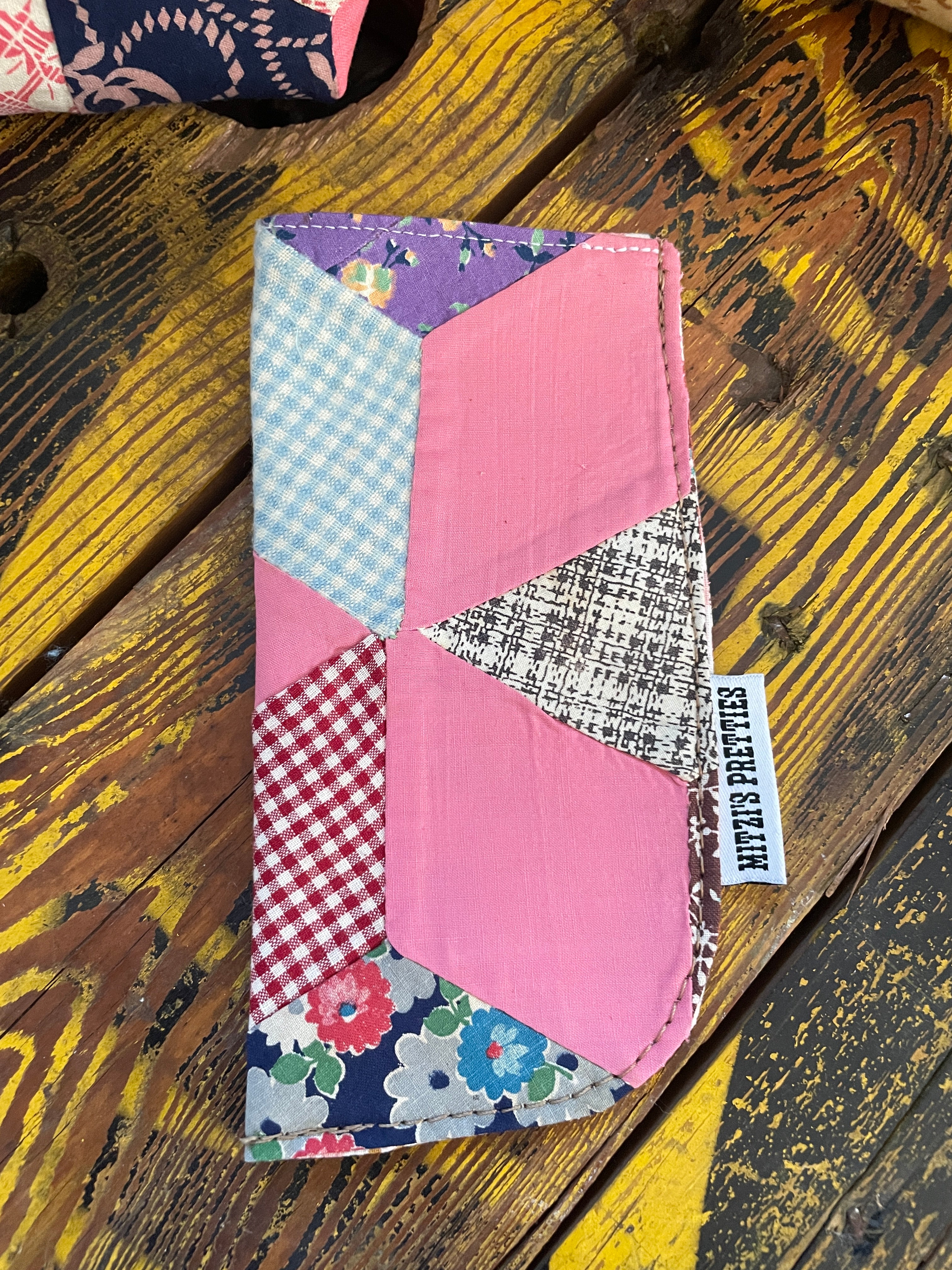 I made this mini wallet with an antique hand stitched vintage quilt. I did repair the quilt where there were worn areas and also applied fray check to areas to prevent the fabric from fraying. One of a kind!🩷