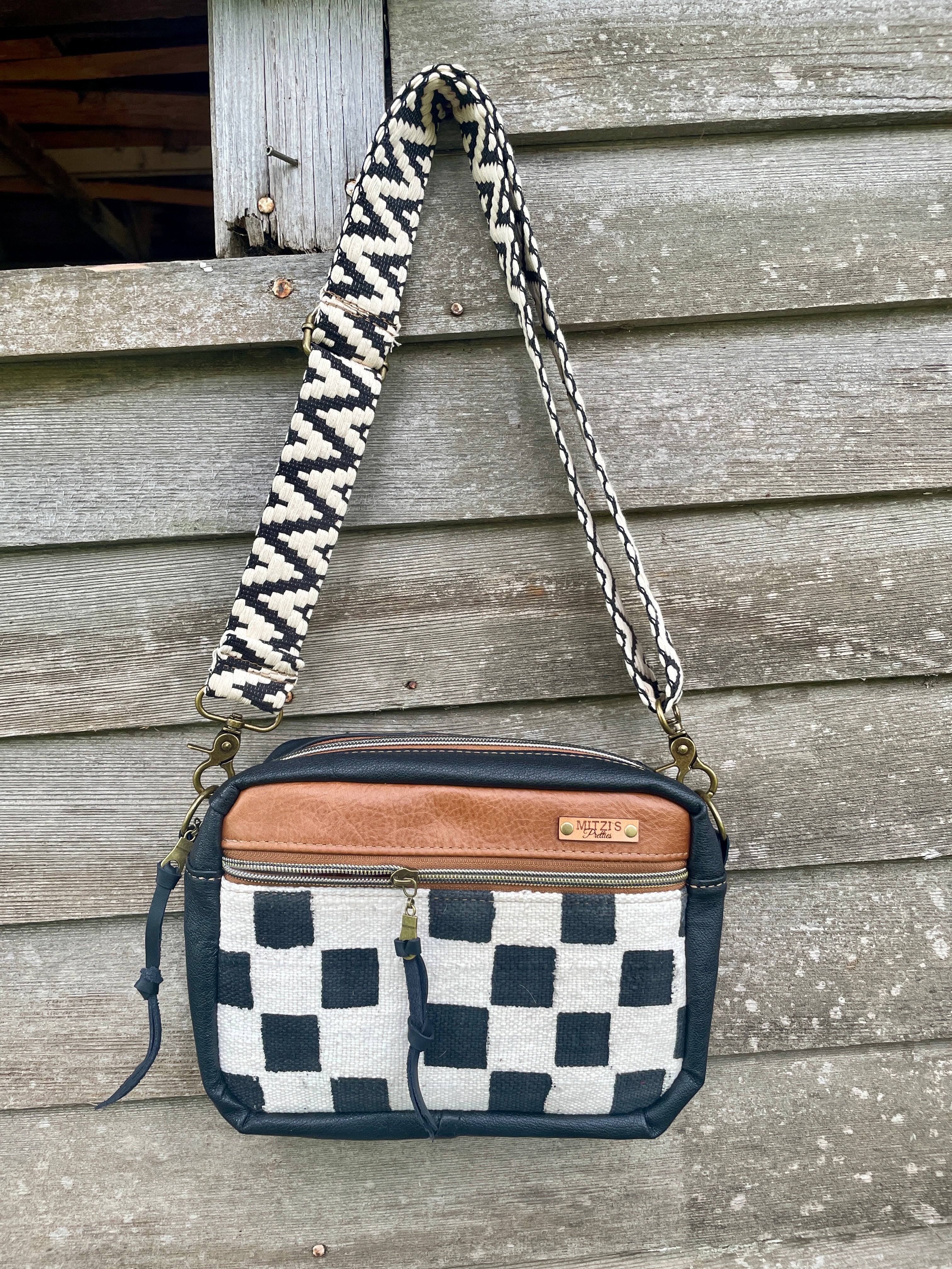 The strap is made of genuine leather and is adjustable for cross body/ shoulder wear.