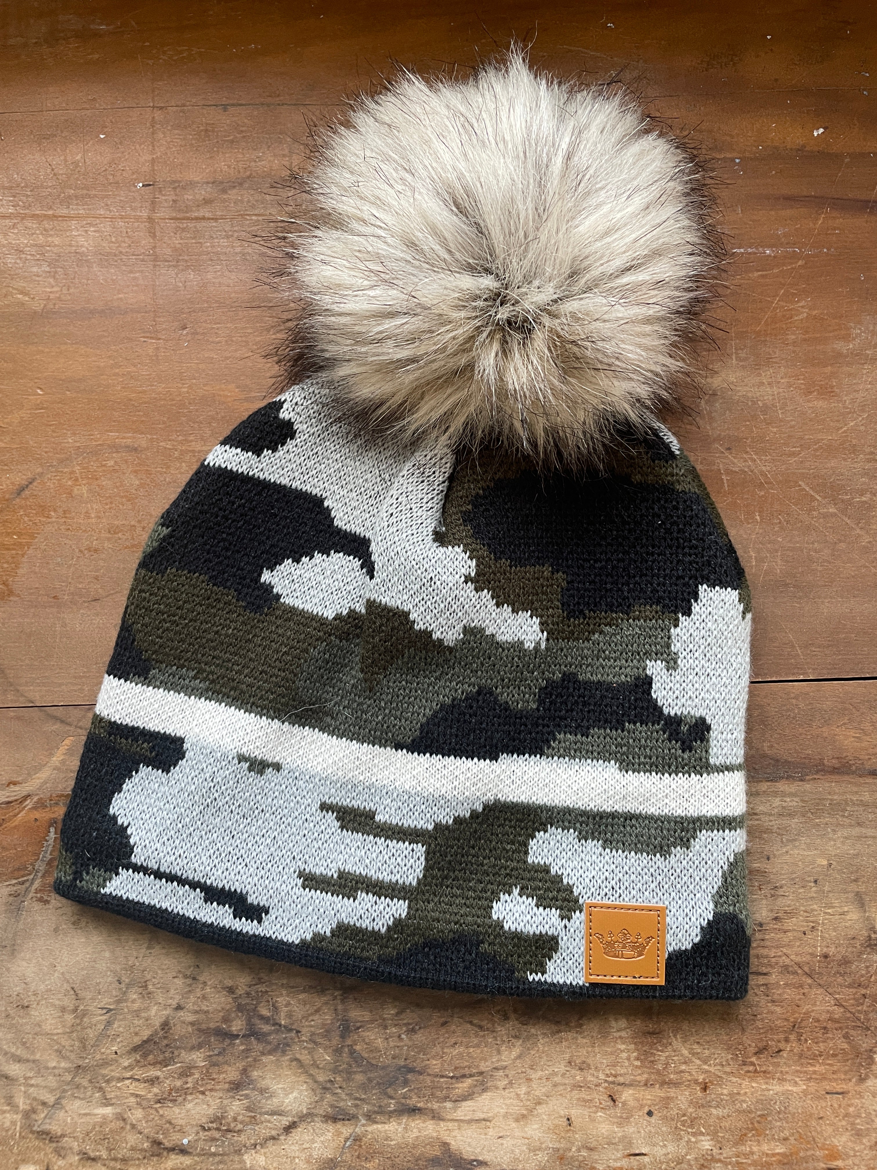 Camo w/ Ivory Stripe Beanie w/ Pom