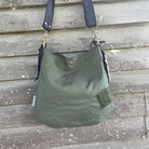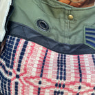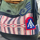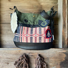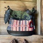 The front of the bag is made in military canvas, black supple leather, 1800s wool, & vintage military patches.