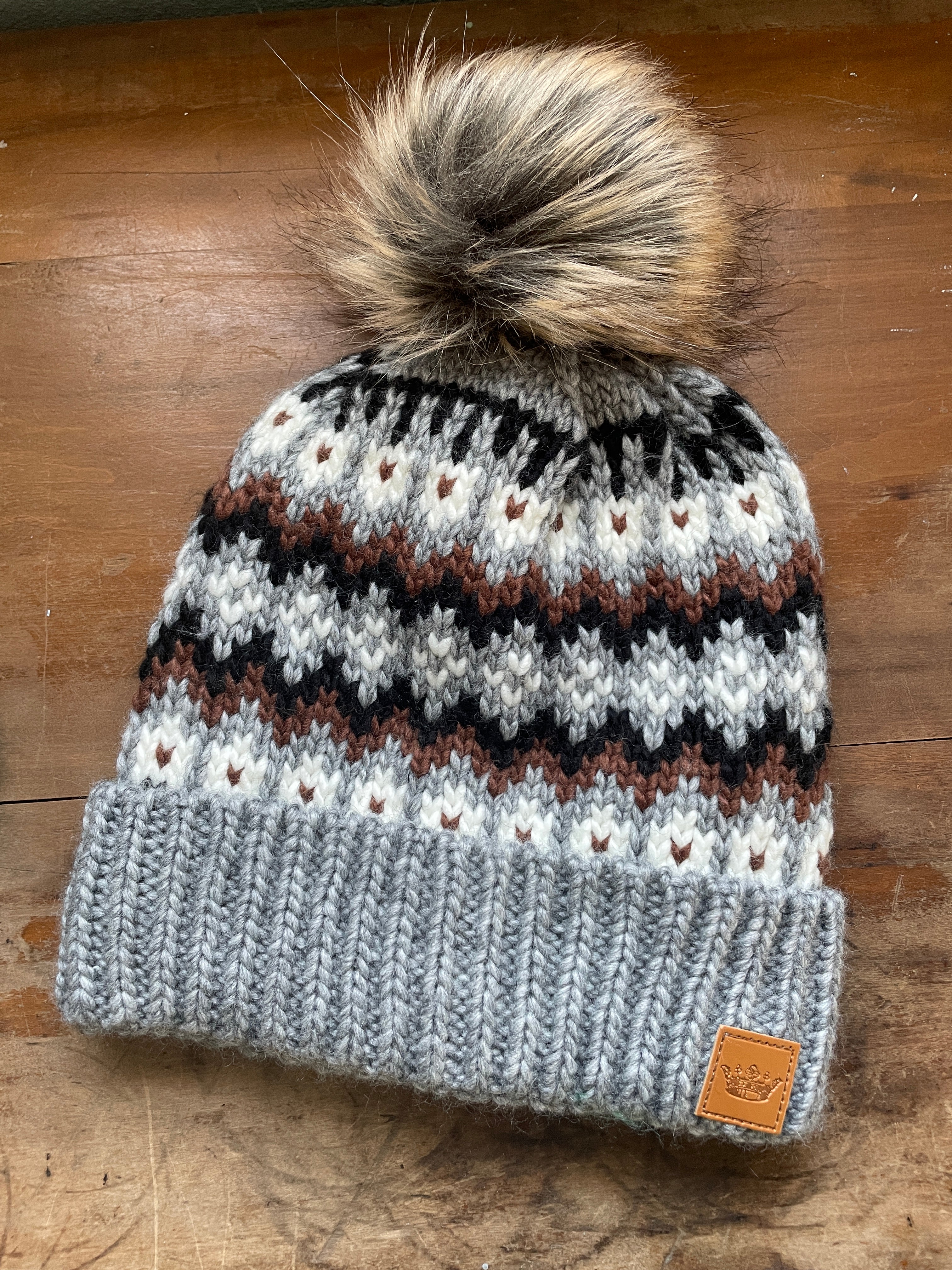 Gray & Brown Patterned Knit Pom Hat