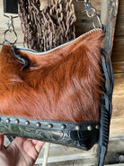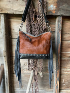 One of my fav bags! Made of super soft cowhide, embossed leather, black leather and adorned with side fringe!