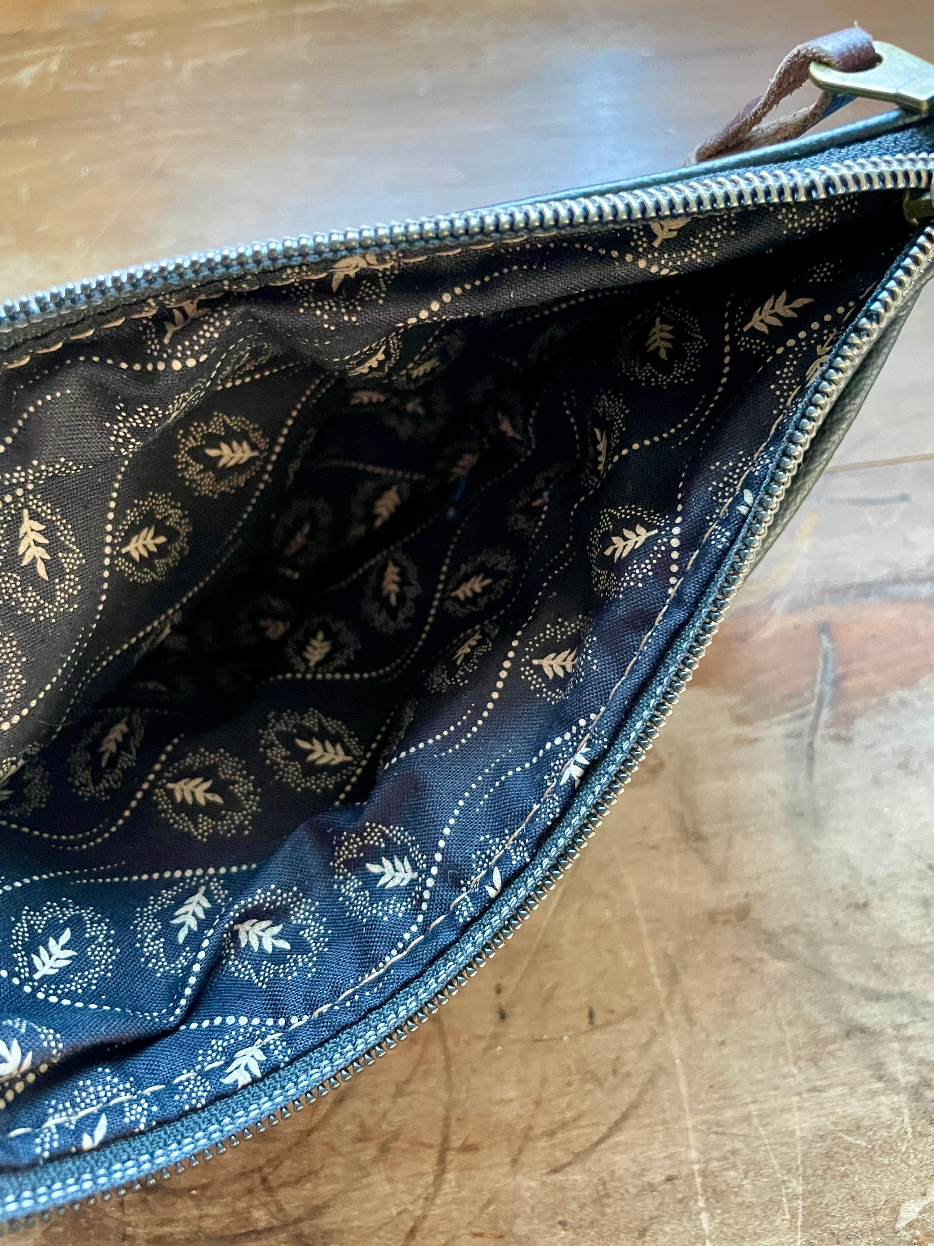 Interior is a lined in a cotton fabric. Exterior features a pocket that closes with a snap.
